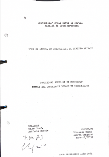 Si laurea nel 1983 in tre anni e una sessione con il massimo dei voti e la lode, con una tesi di diritto privato, intitolata "Condizioni Generali di Contratto Tutela del Contraente Debole ed Informatica", nel quale delinea la capacitá del sistema Italgiure della Corte Suprema di Cassazione di interpretare e comprendere i contratti bancari ed assicurativi al fine di segnalare al magistrato giudicante possibili clausole abusive. Non esistendo in Italia una legislazione a tutela del consumatore, la tesi analizza i rimedi messi a disposizione nell'ordinamento tedesco, con particolare attenzione alla collaborazione fra Bundeskartellamt e magistrati.